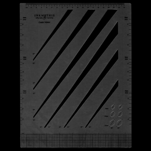 來自美國「Inkmethis」所設計的英文書法多功能間隔尺,尺寸21.6 x 28.0cm,接近A4大小。尺的上方顯示毫米尺(mm ruler),下方為英吋方格尺,左右有提供三種x-height,包含4mm(2:1:2)、4mm(3:2:3)、5mm(3:2:3),中間有6格52度和55度斜度,方便練寫英文銅板體或史賓賽體; 且右下方提供三種橢圓形模板,供您選擇使用。此款尺輕薄透明,且有彈性,方便使用。
