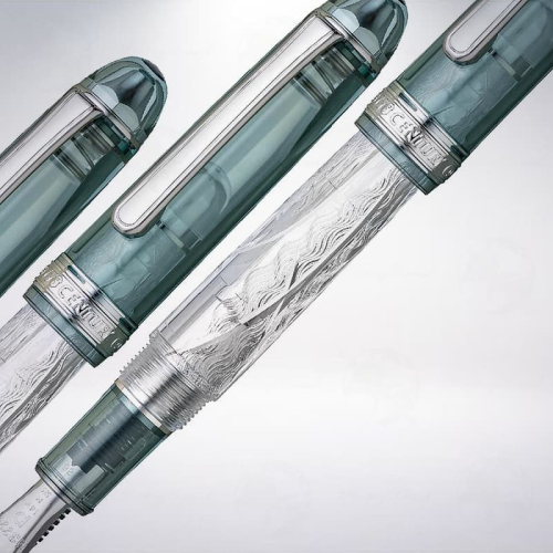 為了慶祝 Platinum白金鋼筆的旗艦型號 #3776 CENTURY 的推出,從2011年至2016年創作出備受喜愛的「富士五湖」系列,接著是2017年至2021年的美麗「富士旬景」系列,這些筆款均使用先進的切割技術在筆身上描繪了富士山壯麗的四季景色。而如今,白金在2023年推出了全新的系列: 「富士雲景」。這個系列的靈感源自雲霧繚繞的富士山景色,透過各種精巧的裝飾捕捉這個自然奇觀的美。第三作就是此次所推出的:「絹雲」,在中文是絲雲的意思,屬於高空卷雲的一種。它的特徵是如同絲綢般輕盈細緻,或呈羽毛狀、纖維狀,散布在蔚藍的天空之中。這種雲彩時常出現在秋日的天空,纖細卻綿延無際,為晴朗的富士山增添了柔和而飄逸的氛圍。此款鋼筆的設計靈感,正是取自秋日裡環繞在富士山上的「絹雲」景象,設計師將雲的流動感轉化為筆身上的雕刻工藝,以「光線刻」與「V刃雕刻」兩種不同的技法交錯運用,展現出既細膩又具動態的紋理。部分區域刻意保留未雕刻的留白,使得透明感的筆身如同晴空般澄澈,而雕刻的曲線則彷彿浮雲飄蕩於空,形成虛實相間的視覺效果。筆身選用了透明筆蓋以及握位帶有微霧質感的淡藍綠色,彷彿再現秋高氣爽時的天穹色澤,搭配透明同色系的筆握與筆蓋,使整體氣質更顯靜謐沉穩,宛如置身富士山下,凝望天際那一抹絲雲的優雅身影,天冠處鑲嵌富士山造型的徽章,並刻有限量編號,賦予每一支筆獨一無二的專屬價值。