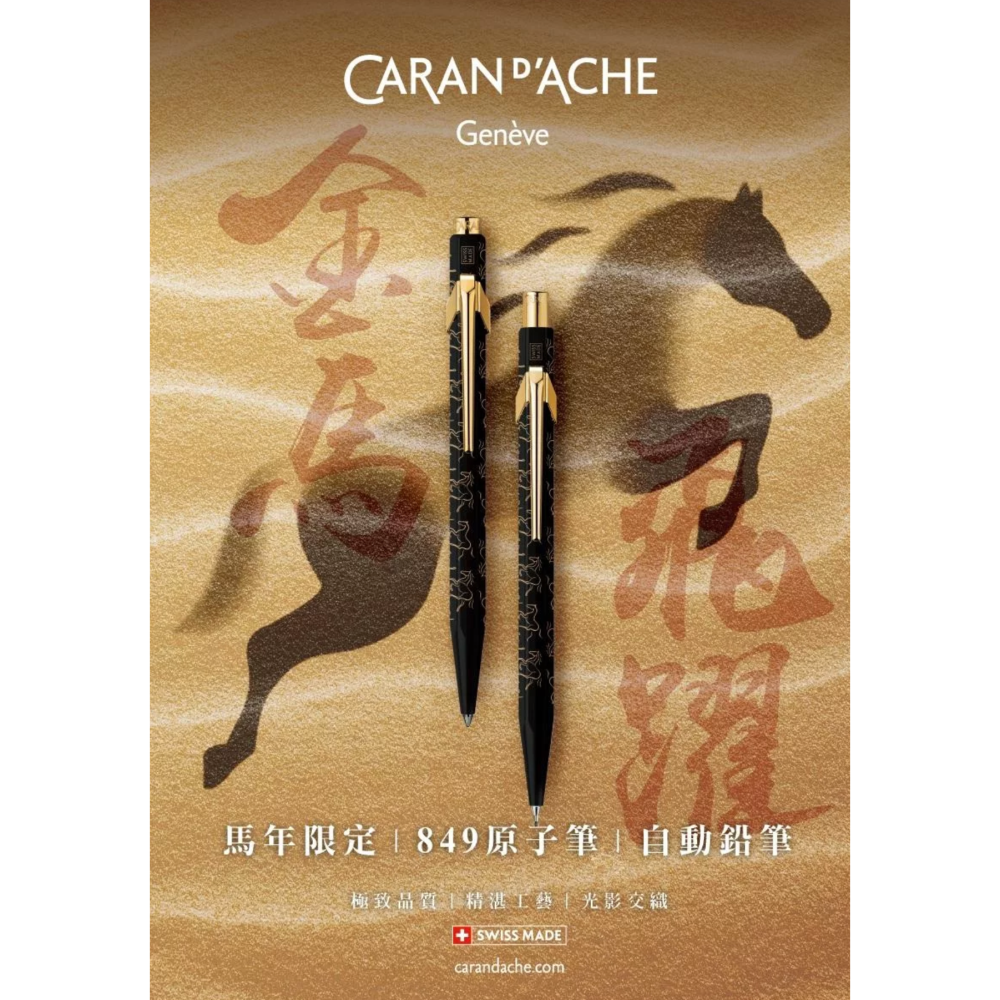「卡達/CARAN D’ACHE」為了即將來臨的2026年所推出849馬年特別版原子筆:(849 Horse)和844馬年特別版自動鉛筆,向馬的力量、優雅與高貴致意。結合節慶氛圍的黑色、金色調,開啟嶄新的創意之旅。 這家瑞士公司將其標誌性的849原子筆:融入生肖設計,歡慶2026馬年的到來。以「瑞士製造」最嚴格的品質標準,在位於日內瓦的工坊設計和製造,完美展現的極致品質與精湛工藝,其精緻的造型與光影交織的和諧之美,格外吸引目光。深邃的黑色筆身飾以金色奔馳駿馬輪廓,生動呈現馬自由奔放的姿態與力量。 鍍金筆夾與按鍵光澤璀璨,與黑色筆身形成優雅對比,彰顯馬的尊貴風範與活力。搭配馬年特別版黑色金屬筆盒,是珍藏與贈禮佳品。每一細節皆凝聚匠心,展現非凡品味。圖三是原子筆,圖四是自動鉛筆。
