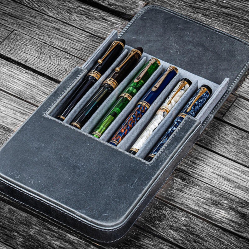「Galen Leather Co.」是一家家族企業,總部位於土耳其伊斯坦布爾。標榜100%手工製作,精心設計的手工皮具系列在過去幾年風靡文具界。外觀仿舊的煙燻灰色處理,呈現黑色和深灰色的底色。每個產品都來自於實用的設計和有意義的構造,從而生產既實用又美觀的東西。材質上使用100%植鞣牛皮(瘋馬皮也稱瘋牛皮),全粒面皮革,使用打蠟聚酰胺線手工縫製,邊緣經過斜切、打蠟和拋光處理,打造完美外觀,帶隔板的天鵝絨內襯可拆卸托盤,內含6個獨立筆槽,可容納長度約16.0cm軸徑約1.55cm的筆記具,包括超大尺寸的鋼筆,例如Montblanc 146、Montblanc 149、 Pelikan Souveran M800、 LAMY Safari、LAMY Al-Star、TWSBI 580、TWSBI VAC 700、Parker Sonnet、Platinum 3776等,中間的筆插組為活動式,必要時可以將其取出方便使用。