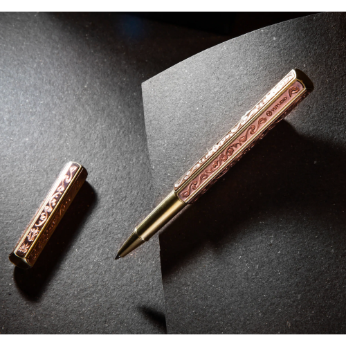 龍紋錺金具鋼珠筆採用品牌創立以來最受歡迎的經典核心系列鋼珠筆為基底製作而成。鋼珠筆的筆身特色源自鉛筆的六角柱體外型,每一次使用都能喚回人們小時候第一次拿筆時的興奮與感動;實心的黃銅材質筆身,搭載德國Schmidt近百年工藝所生產的筆芯,精準配重和滑順的水性書寫特質,帶給使用者極致的手感,讓一筆一畫不再費力,享受書寫的每時每刻。紋路的靈感源自於傳統東方青銅器上的「雲雷紋」,描繪群龍翱翔雲海之中的壯麗景象。當龍首浮現,帶來祥瑞祝福,孕育著萬物生生不息的自然循環。