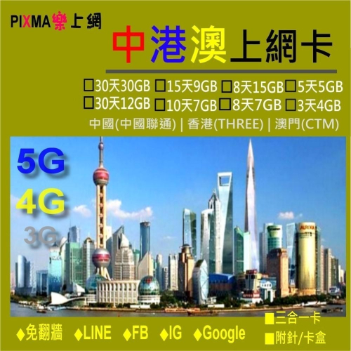 中國大陸 香港上網 澳門上網卡 免翻牆中國上網1天~365天 5G/4G/3G訊號 吃到飽SIM