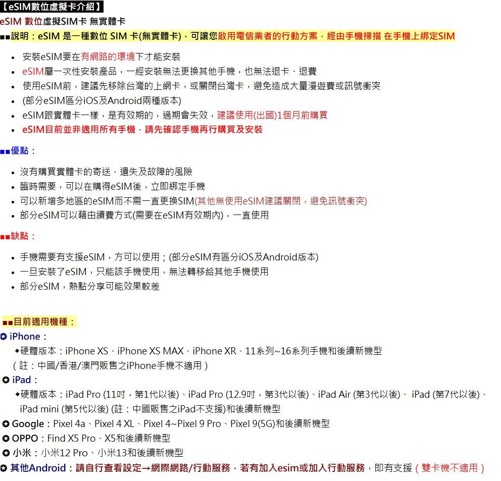 ◆ eSIM目前並非適用所有手機,請先確認手機再行購買及安裝
