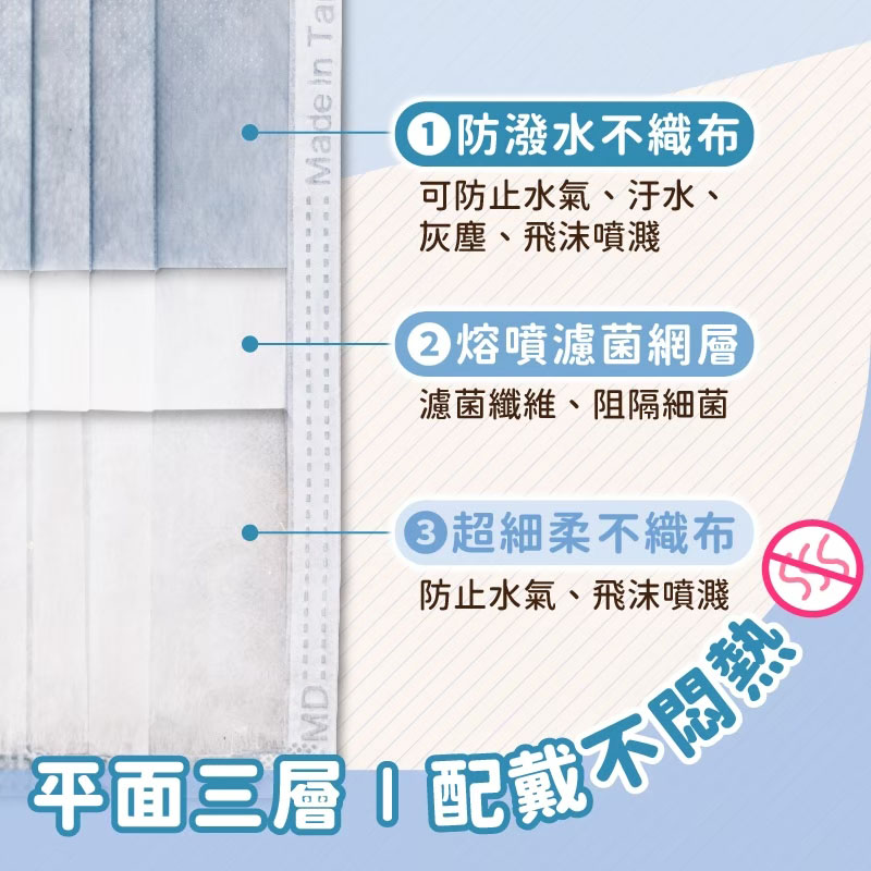 主要材質:防水不織布、熔噴濾菌網層、超細柔不織布