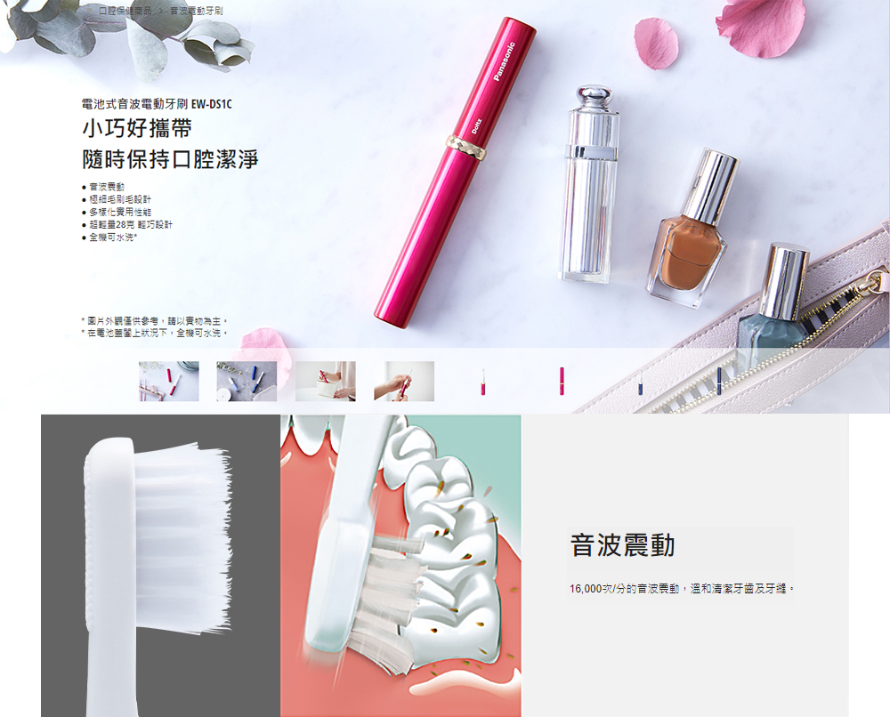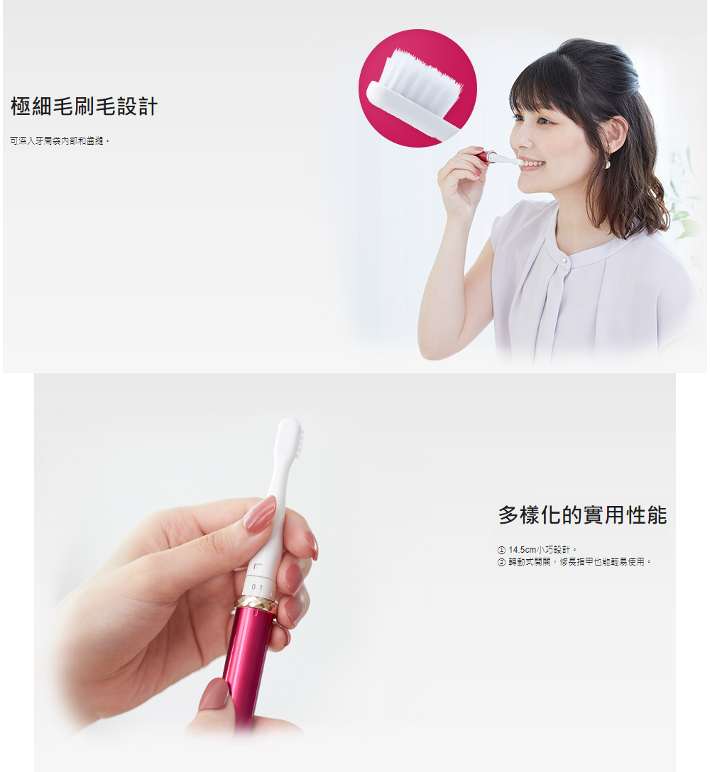 型號:EW-DS1C 顏色:海軍藍(A) 產品特點:音波震動16,000次/分 極細毛刷毛設計 多樣化的實用性能 超輕量28克 輕巧設計 全機可水洗* 電池:乾電池 電源:LR03(AAA鹼性乾電池)x1 (須另外購買) 更換刷頭:EW-DS1C專用更換刷頭 WEW0968-W(白) 備註:* 在電池蓋闔上狀況下,全機可水洗。 |