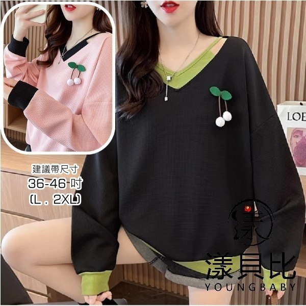 漾貝比中大碼【9154867】俏皮櫻桃V領假兩件式華夫格上衣.黑/粉(36-46)