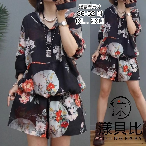 漾貝比【9155086】中大尺碼女裝 前開釦連帽日系花朵七分袖縈麻套裝 (36-52)