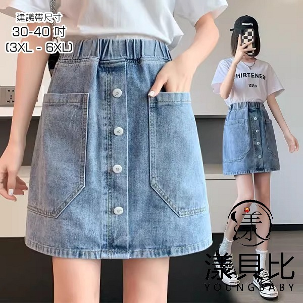 漾貝比【9155114】中大尺碼女裝 百搭多角大口袋排釦鬆緊牛仔裙 (30-40)