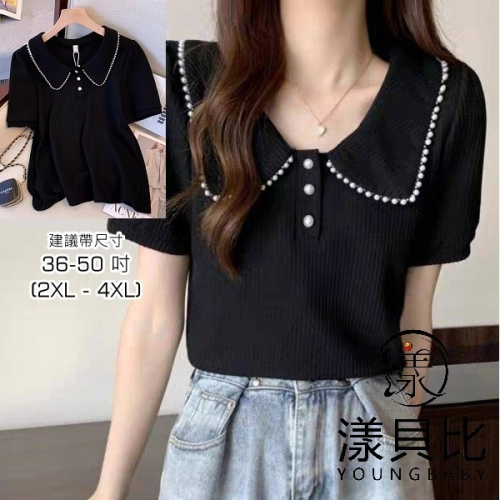 漾貝比【9155121】中大尺碼女裝 珍珠滾邊前開釦公主袖針織上衣.黑 (36-50)