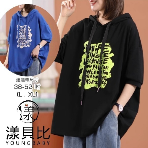 漾貝比【9155137】中大尺碼女裝 美式YOURE撞色框連帽垂繩寬鬆棉T.共2色 (38-52)
