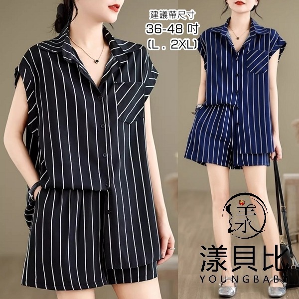 漾貝比【9155192】中大尺碼女裝 幹練條紋顯瘦襯衫+短褲兩件套裝.藍/黑