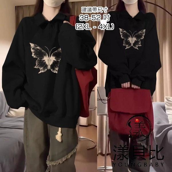 漾貝比【9155215】中大尺碼女裝 黑色蝴蝶半開拉鍊polo領休閒T(38-52)