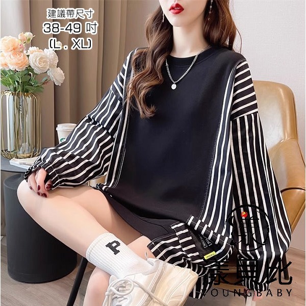 漾貝比【9155218】中大尺碼女裝 圓領撞色拼接條紋大口袋布標T(38-49)