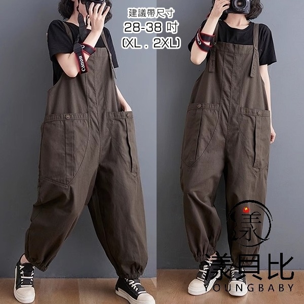 漾貝比【9155233】中大尺碼女裝 箭頭大口袋純色縮口工裝吊帶褲.灰(28-38)