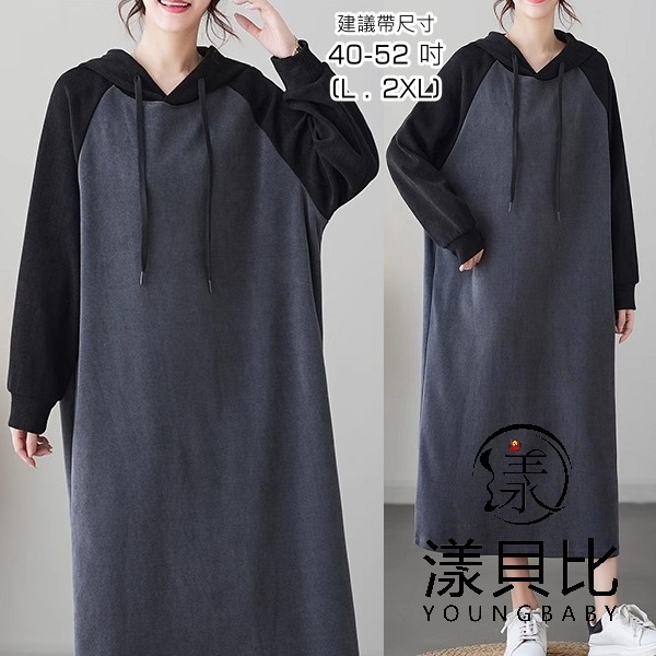 漾貝比【9155277】中大尺碼女裝 英格蘭袖撞色連帽加厚中長版洋裝(40-52)