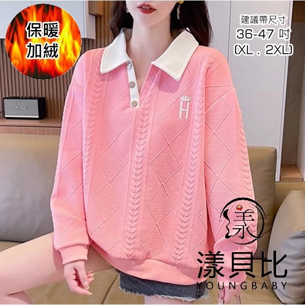 漾貝比【9155296】中大尺碼女裝 刺繡皇冠撞色立體菱格加絨POLO上衣(36-47)