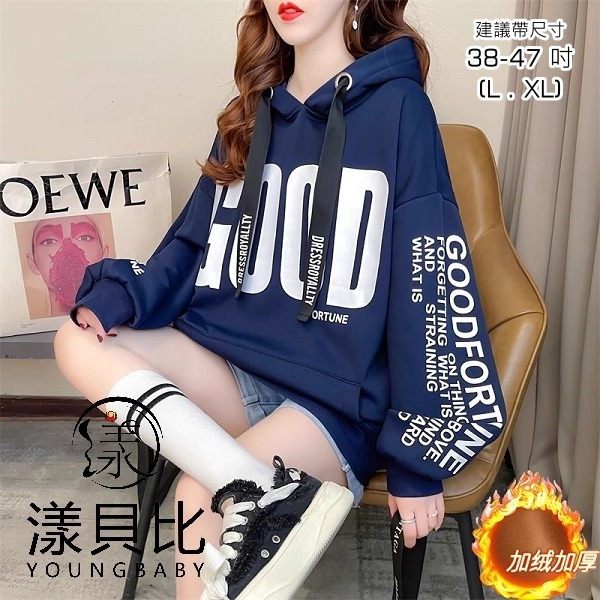 漾貝比【9155305】中大尺碼女裝 GOOD英文連帽口袋垂繩加絨加厚T(38-47)