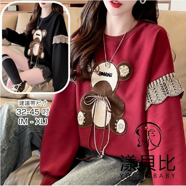 漾貝比【9155307】中大尺碼女裝 韓版袖拼接荷葉蕾絲水鑽小熊織衣上衣(36-46)
