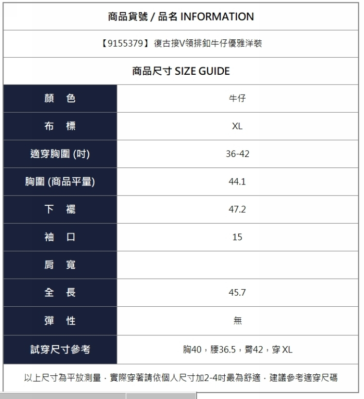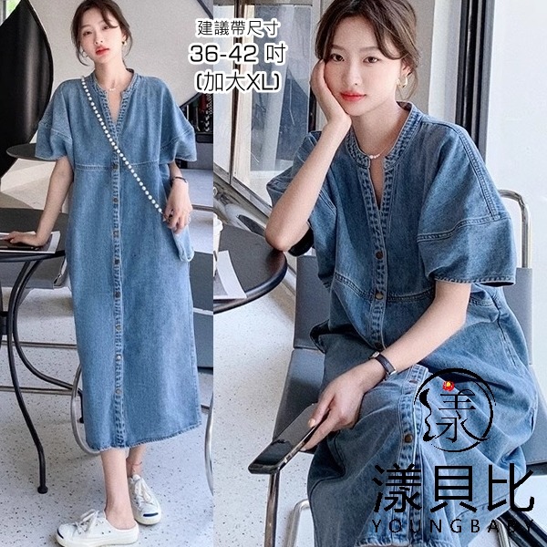 漾貝比【9155379】中大尺碼女裝 復古接V領排釦牛仔優雅洋裝 (36-42)