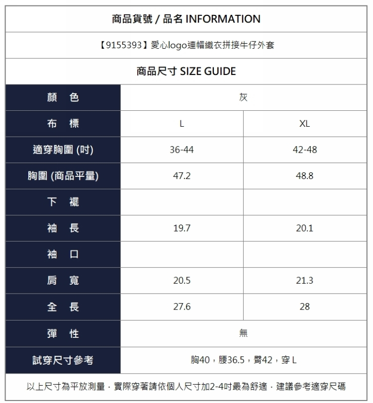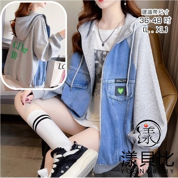 漾貝比【9155393】中大尺碼女裝 愛心logo連帽織衣拼接牛仔外套 (36-48)