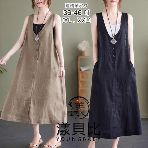 漾貝比【9155416】中大尺碼女裝 深V四釦開叉棉麻背心洋裝.共2色 (36-46)