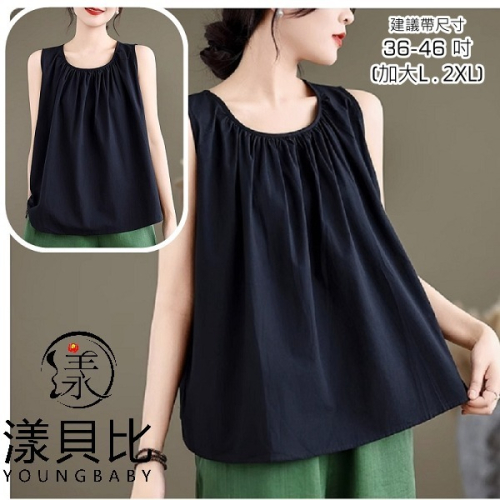 漾貝比【9155418】中大尺碼女裝 圓領胸口抓皺寬肩背心.黑 (36-46)