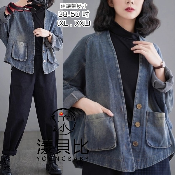 漾貝比【9155429】中大尺碼女裝 立領雙口袋深V領牛仔外套 (38-50)