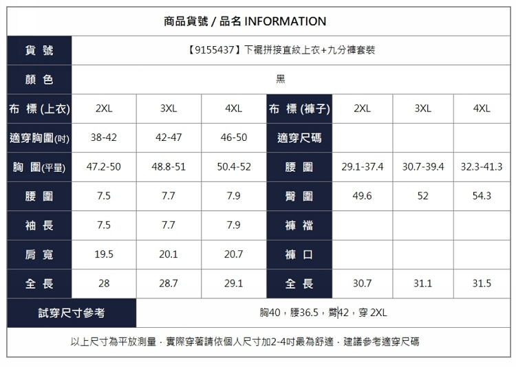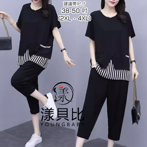 漾貝比【9155437】中大尺碼女裝 下襬拼接直紋上衣+九分褲套裝 (38-50)