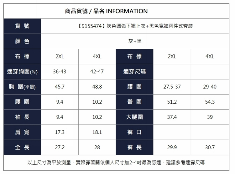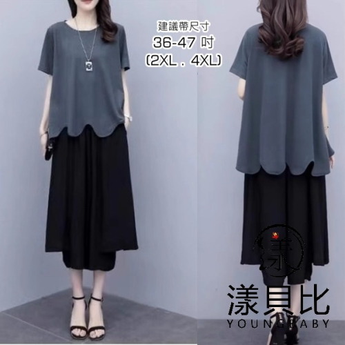 漾貝比【9155474】中大尺碼女裝 灰色圓弧下襬上衣+黑色寬褲兩件式套裝 (36-47)