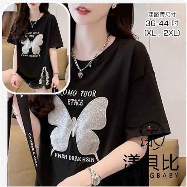 漾貝比【9155479】中大尺碼女裝 ROMO銀色蝴蝶蕾絲開叉造型上衣 (36-44)