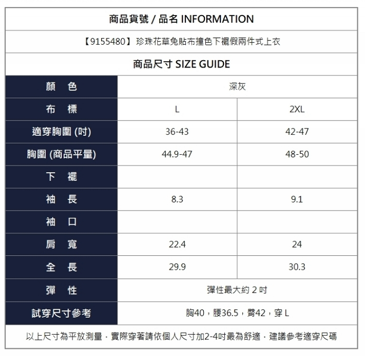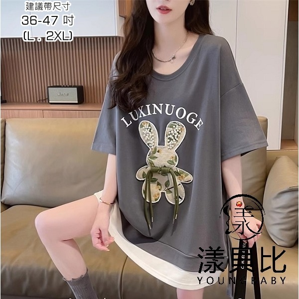 漾貝比【9155480】中大尺碼女裝 珍珠花草兔貼布撞色下襬假兩件式上衣 (36-47)