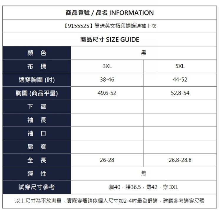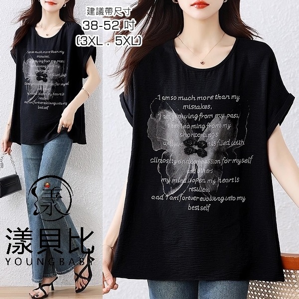 漾貝比【9155525】中大尺碼女裝 燙鑽英文拓印蝴蝶連袖上衣 (38-52)