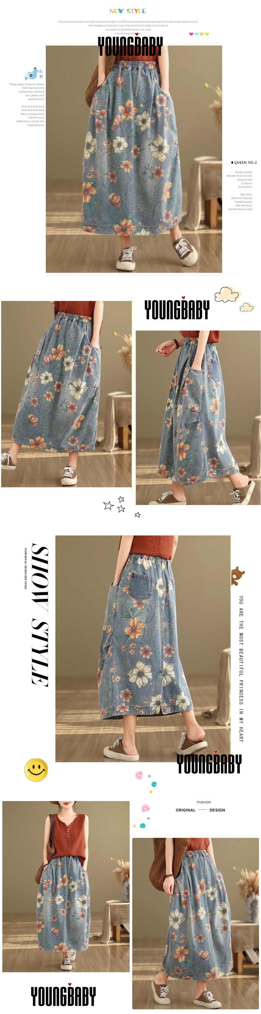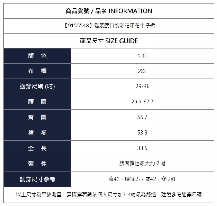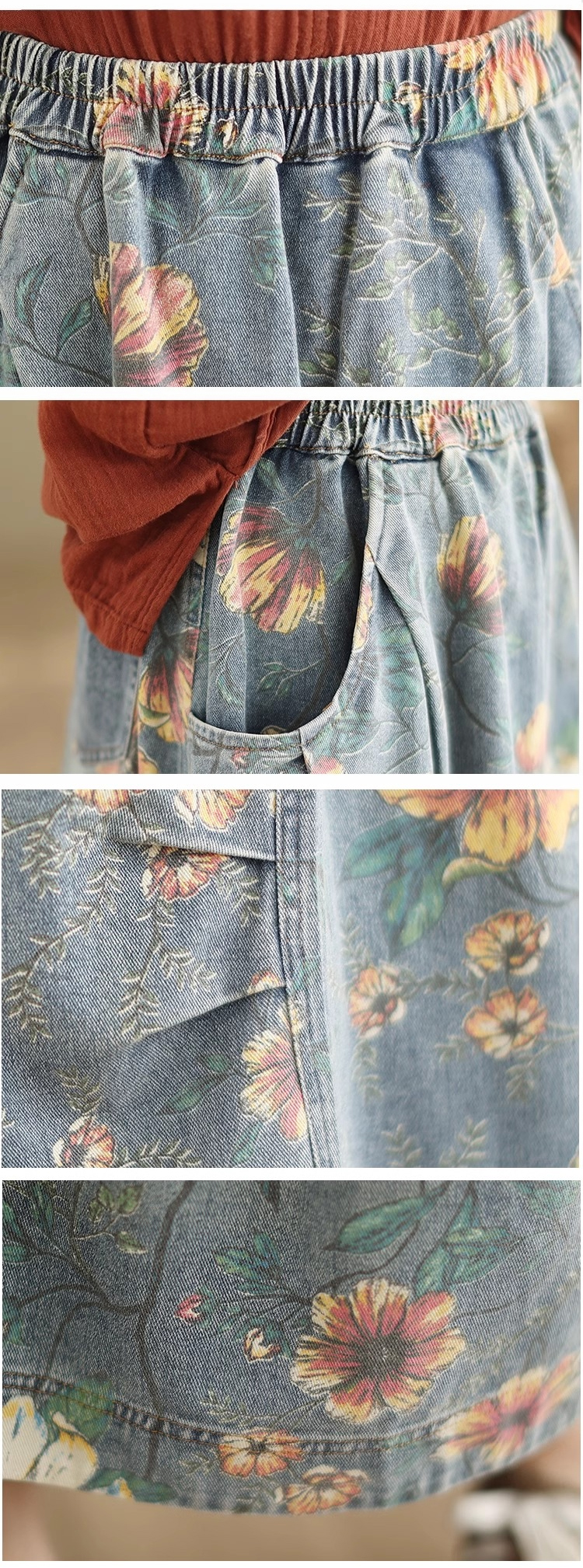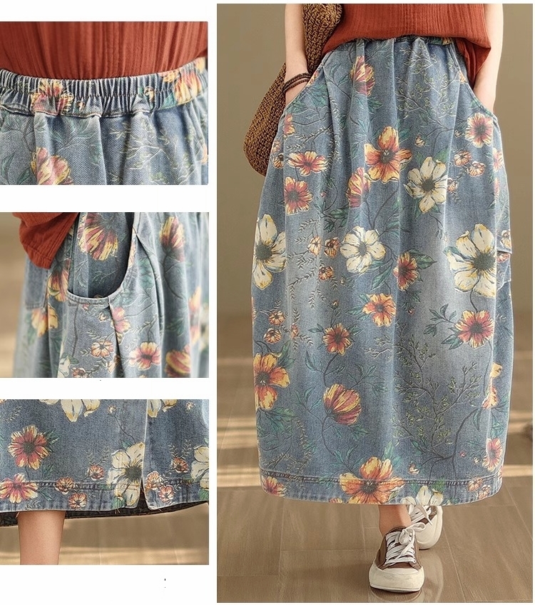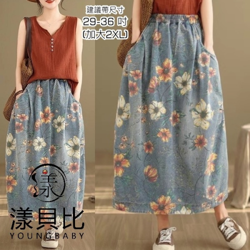 漾貝比【9155548】中大尺碼女裝 鬆緊腰口袋彩花印花牛仔裙(29-36)