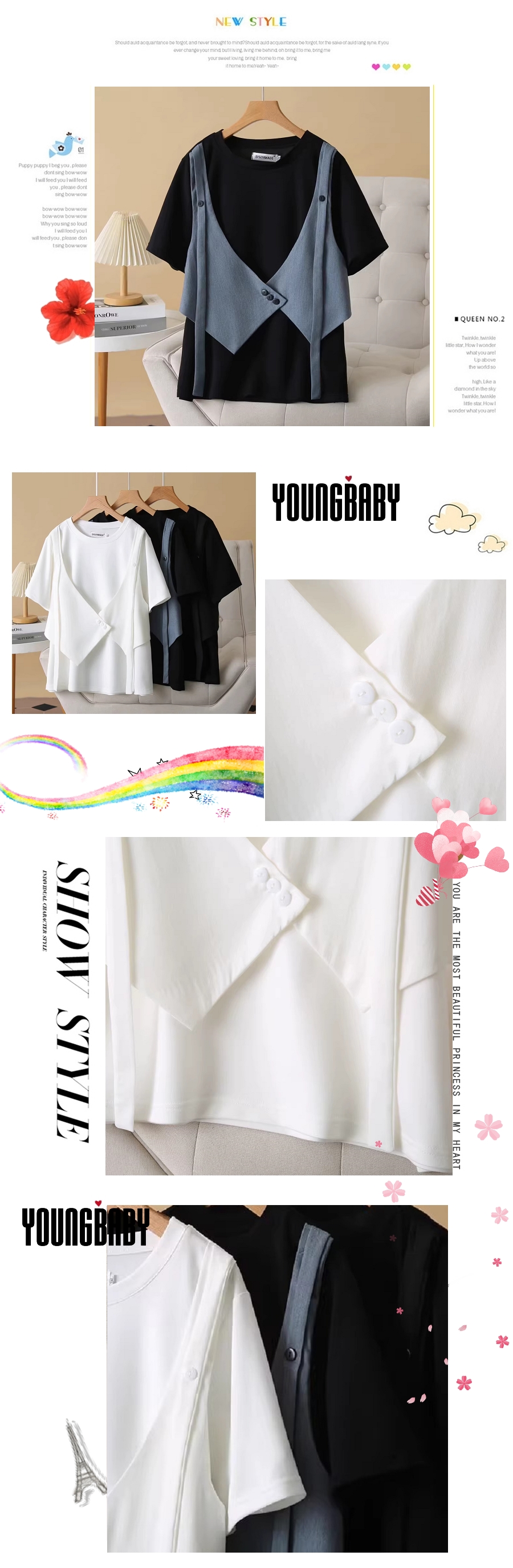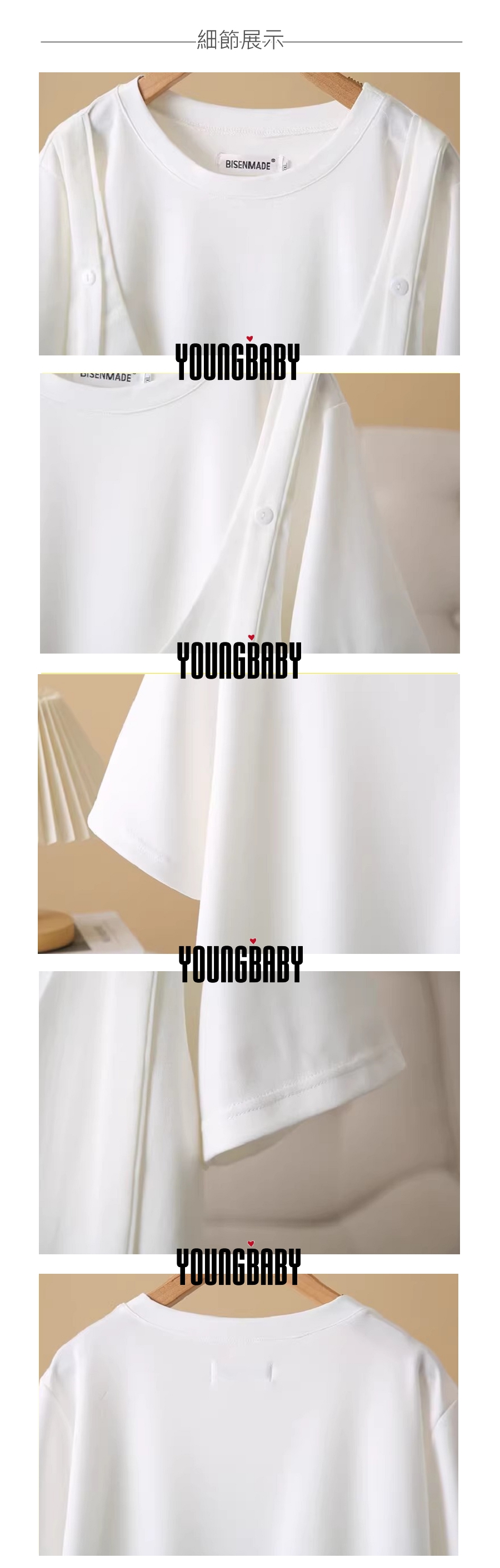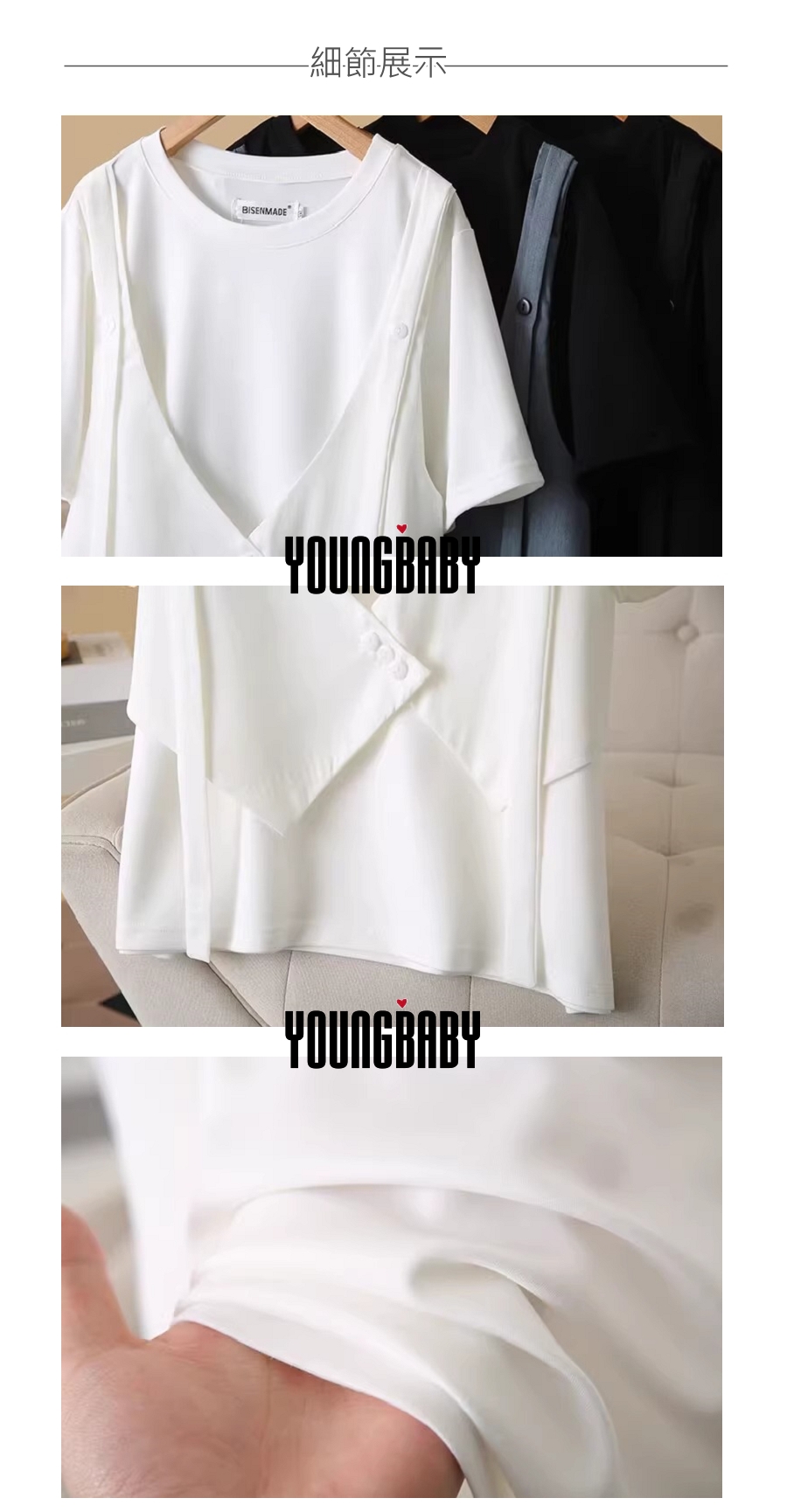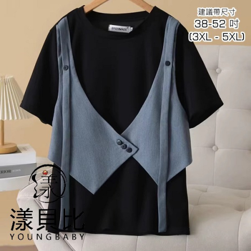 漾貝比【9155572】中大尺碼女裝 圓領T拼接不規則背心假兩件式上衣.藍(38-52)