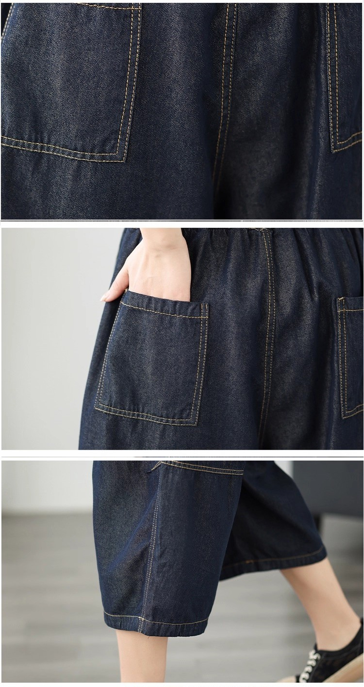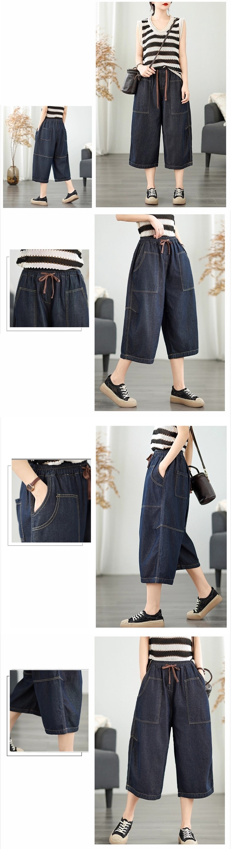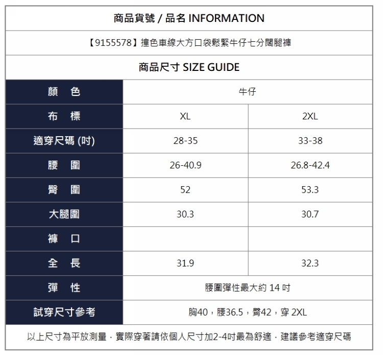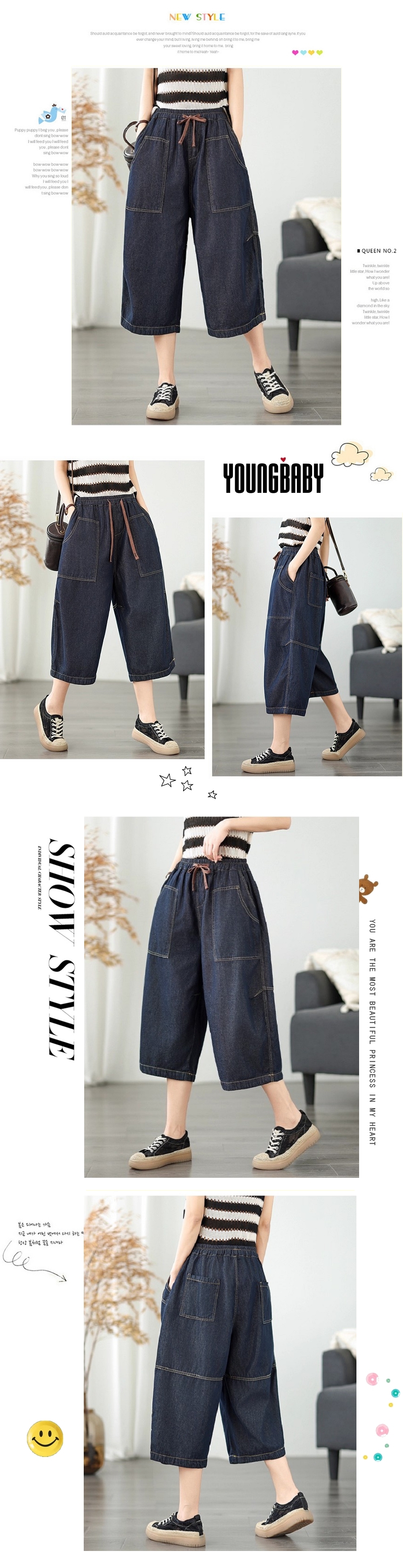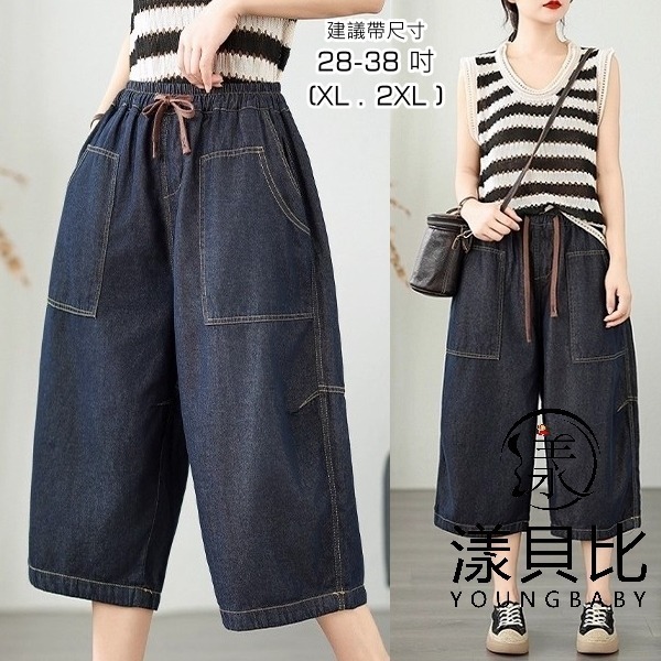漾貝比【9155578】中大尺碼女裝 撞色車線大方口袋鬆緊牛仔七分闊腿褲(28-38)