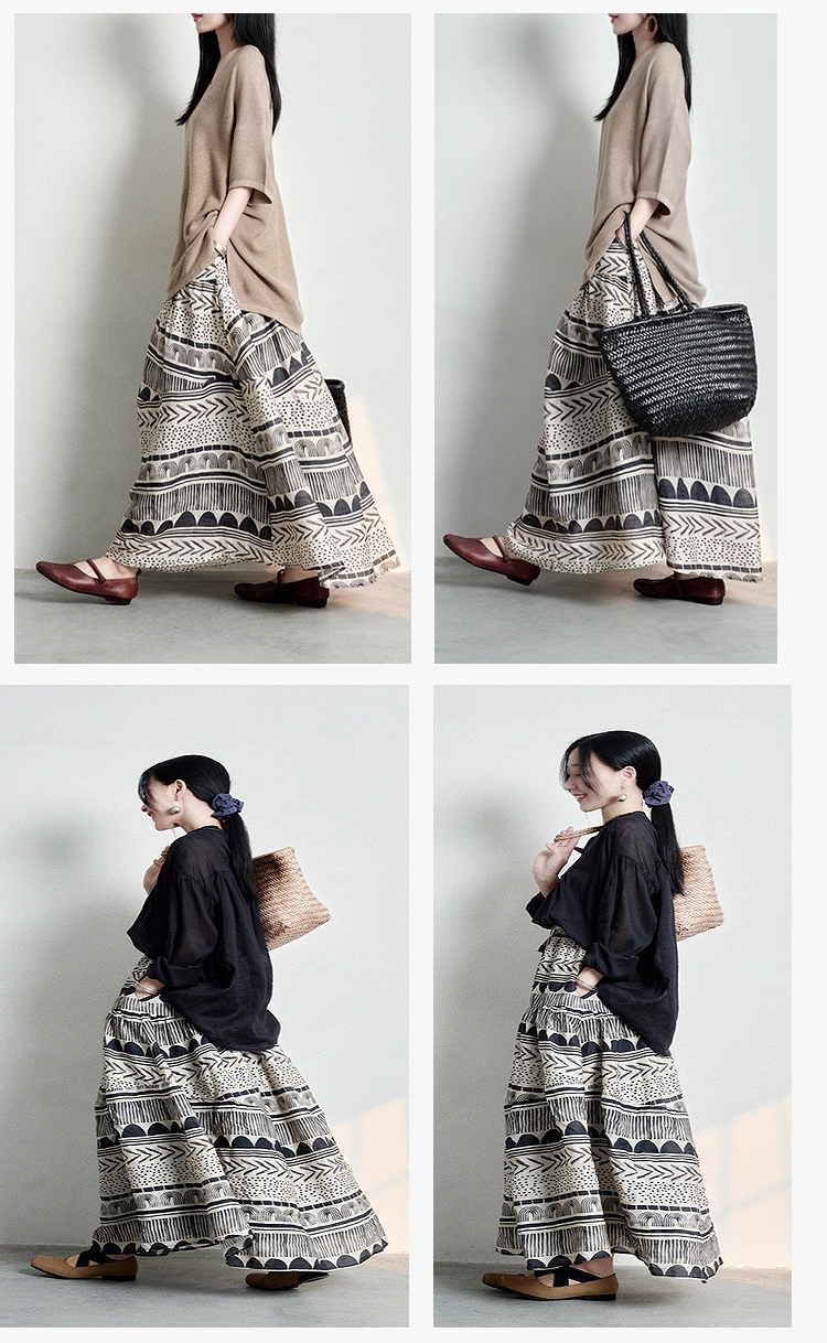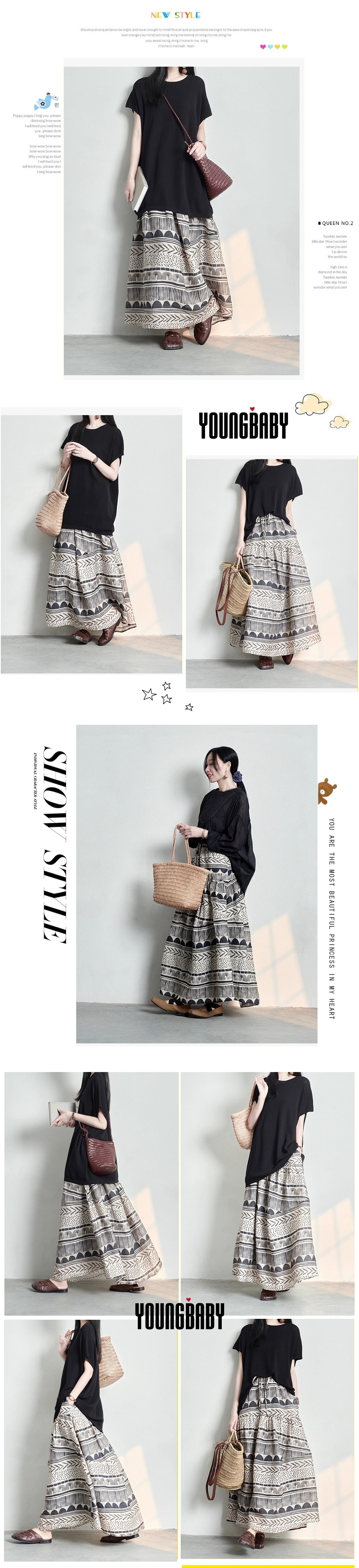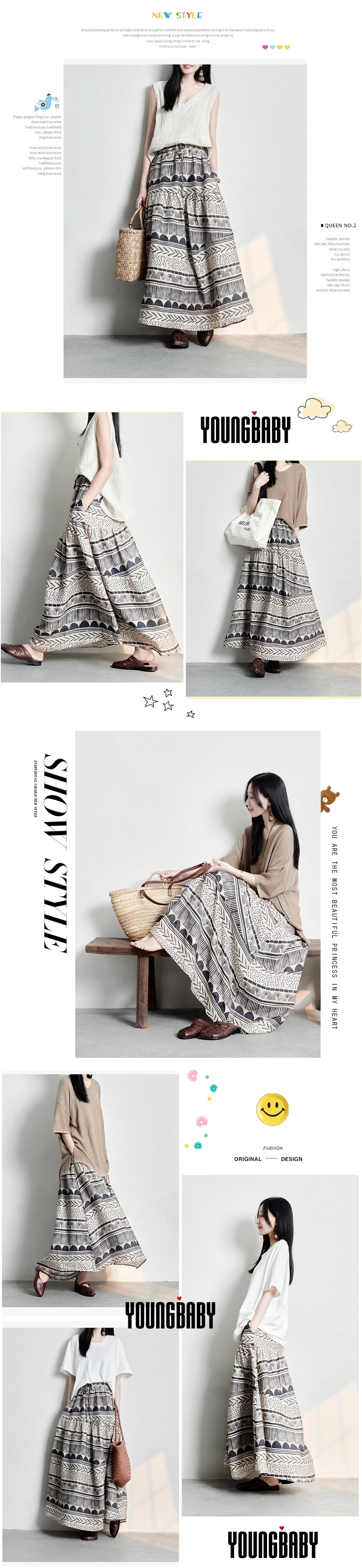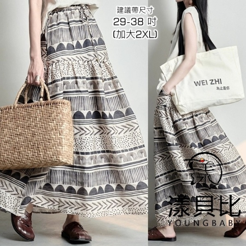 | 【9155591】民俗風層次印花鬆緊腰大襬原麻色長裙 | |