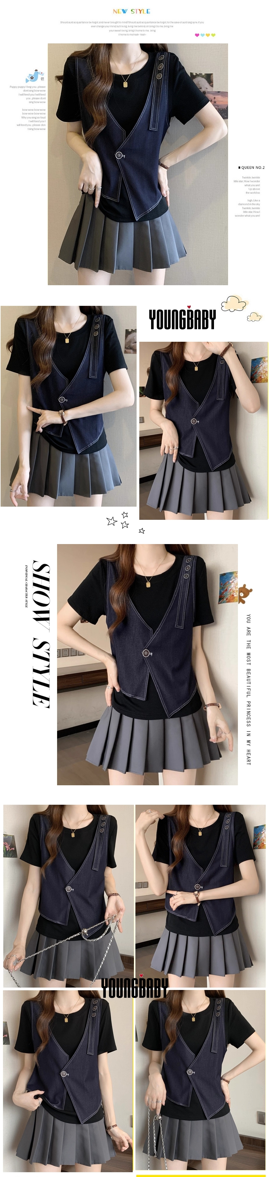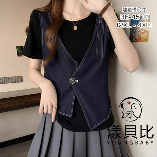 漾貝比【9155596】中大尺碼女裝 深V領拼接牛仔背心假兩件式上衣(36-43)