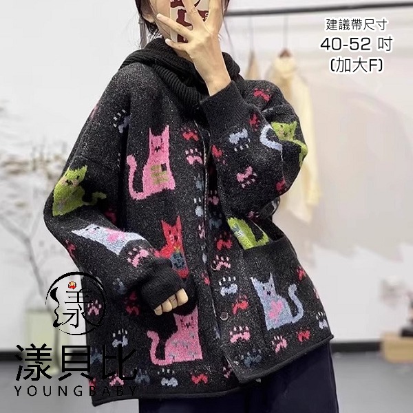 漾貝比【9155627】中大尺碼女裝 森林系小貓咪開襟毛衣外套(38-48)