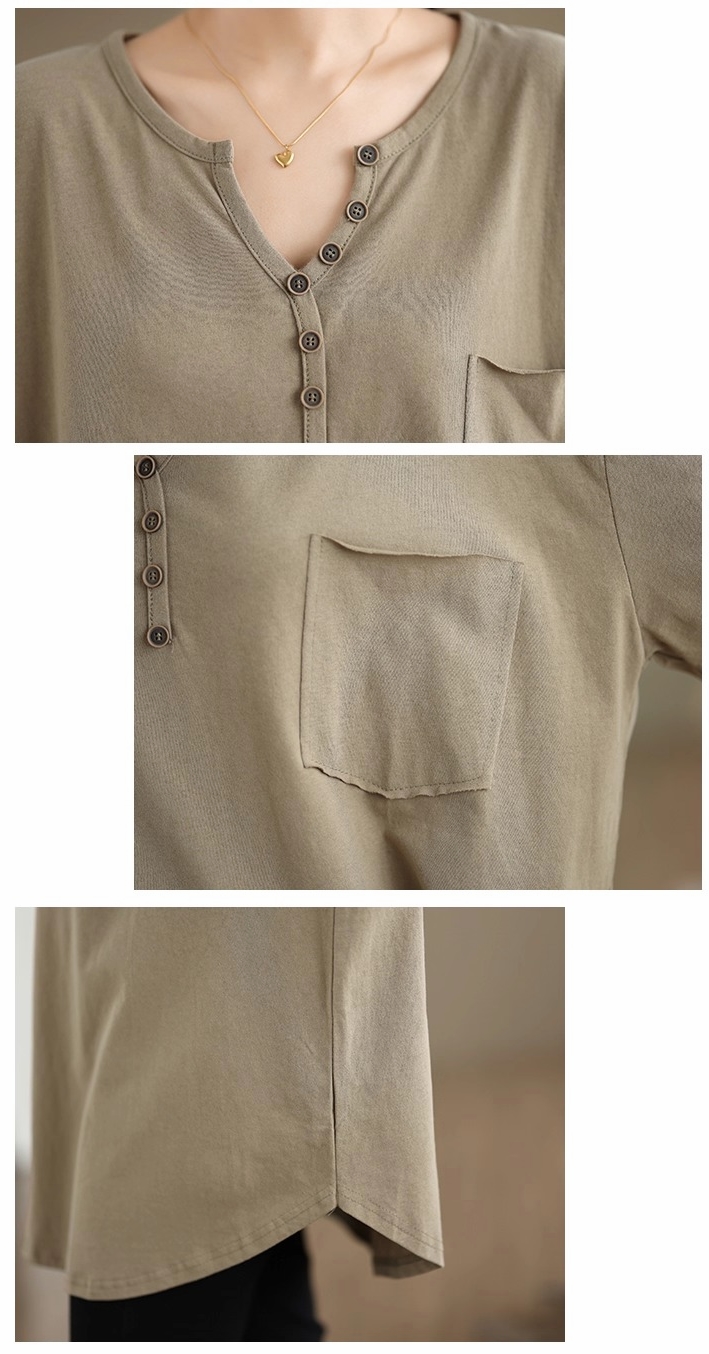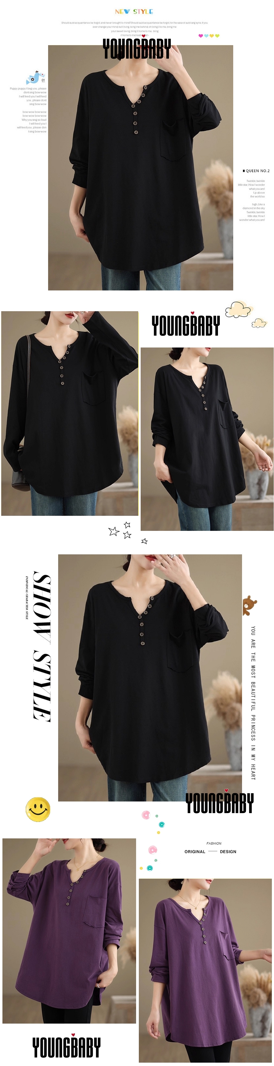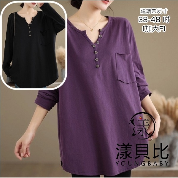 漾貝比【9155640】中大尺碼女裝 純色小V領排釦中長版長袖T.共2色(38-48)