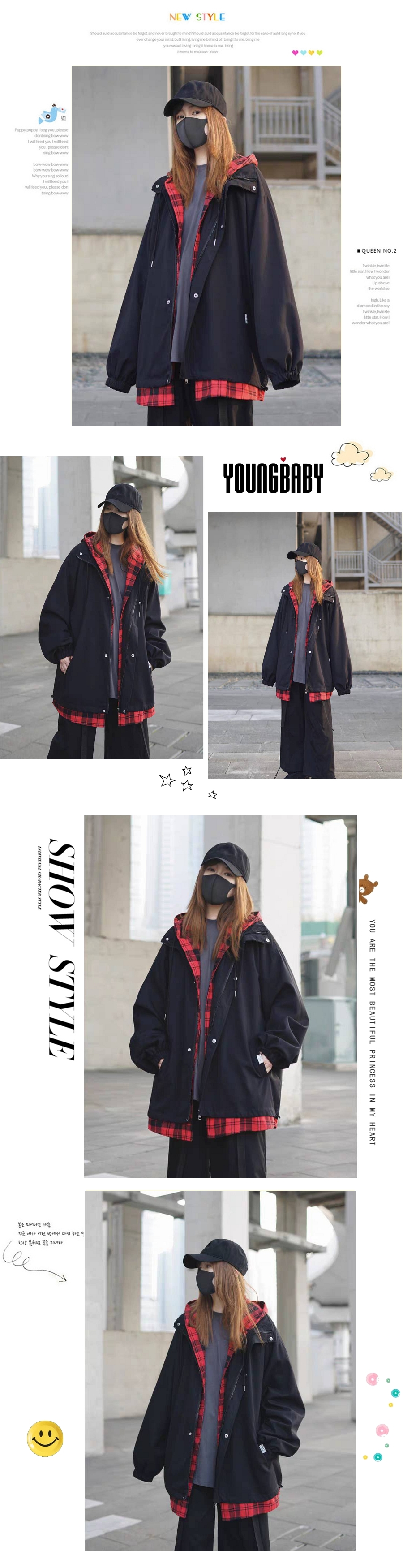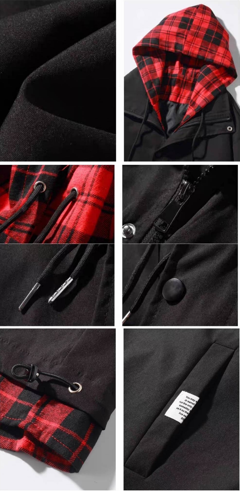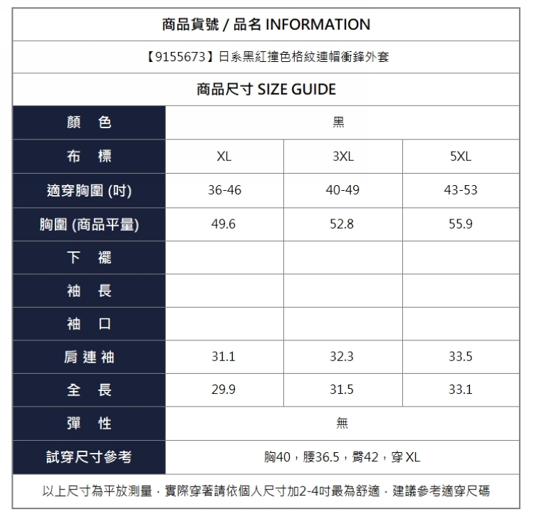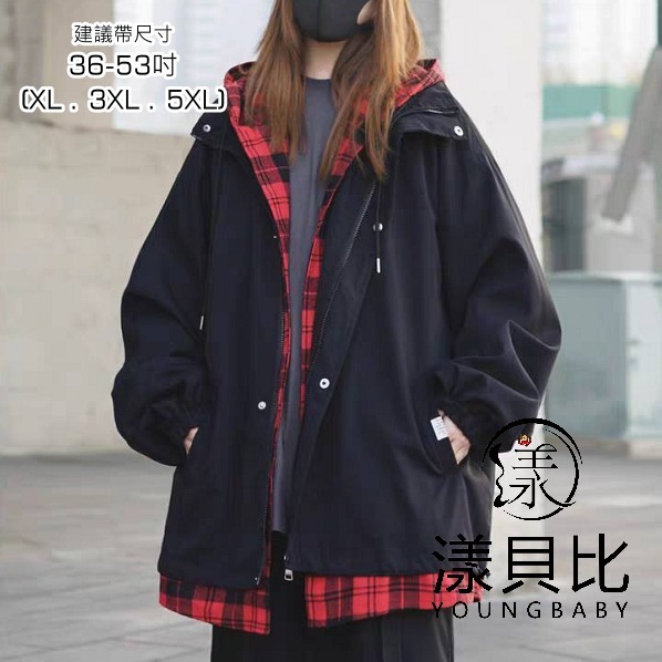 漾貝比【9155673】中大尺碼女裝 日系黑紅撞色格紋連帽衝鋒外套(36-53)