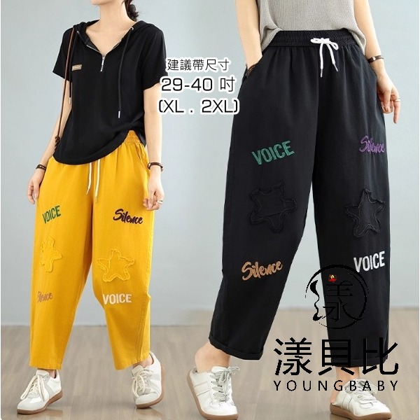 漾貝比【9155675】中大尺碼女裝 貼布星星刺繡英文鬆緊牛仔九分褲.共2色(29-40)