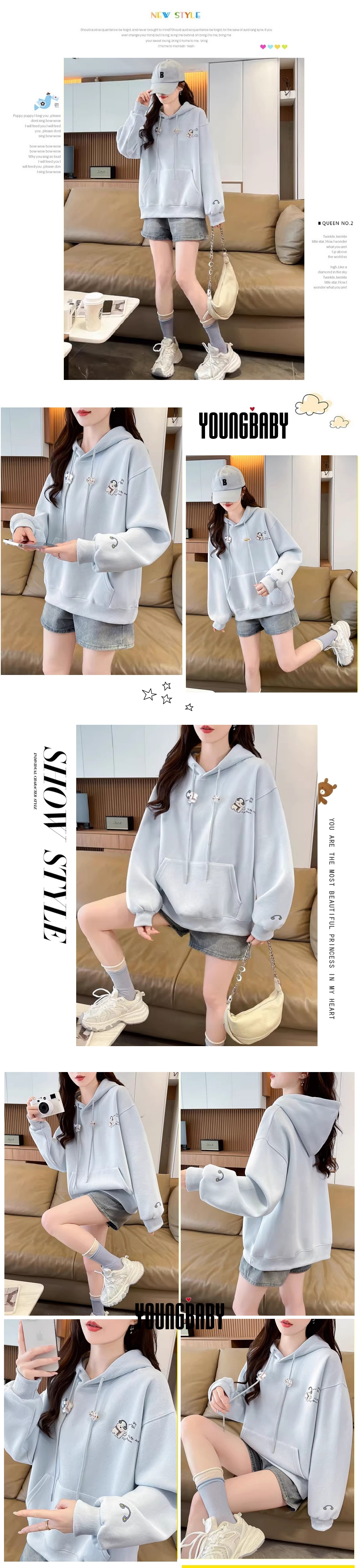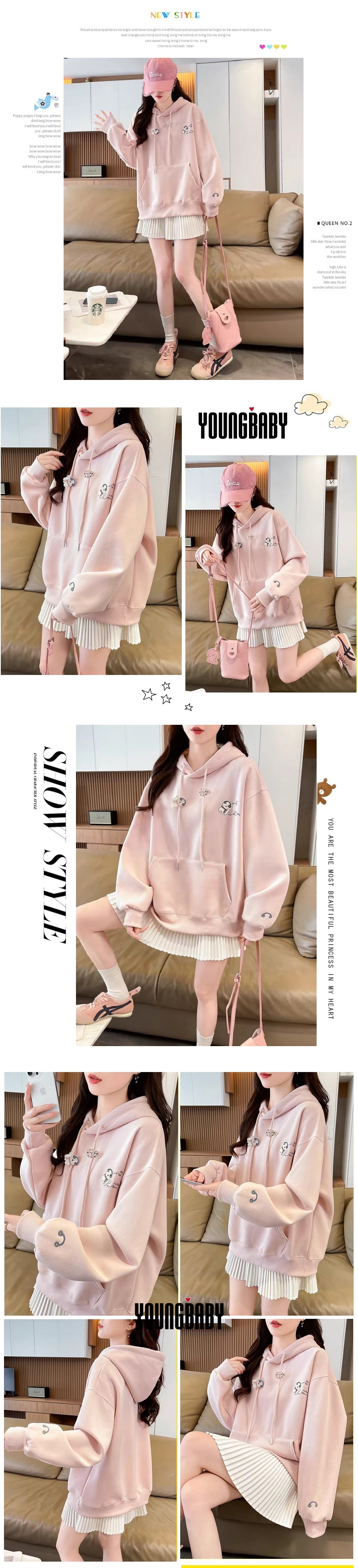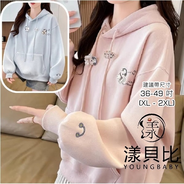 漾貝比【9155713】中大尺碼女裝 刺繡耳機小狗造型垂繩口袋加絨加厚連帽T (36-49)