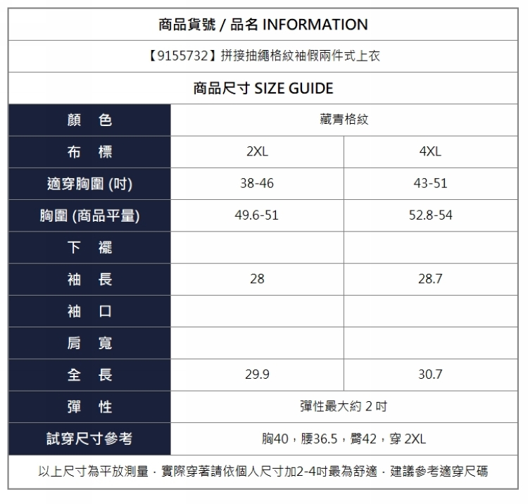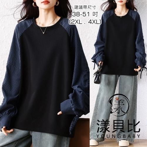漾貝比【9155732】中大尺碼女裝 拼接抽繩格紋袖假兩件式上衣 (38-51)