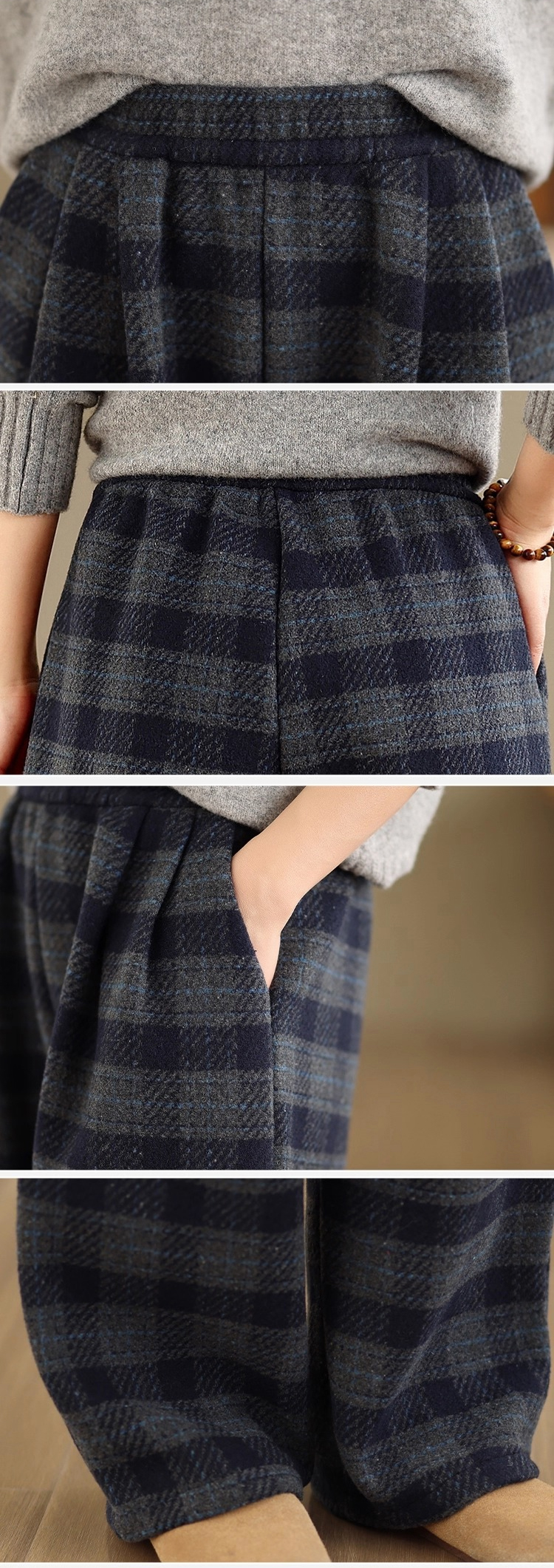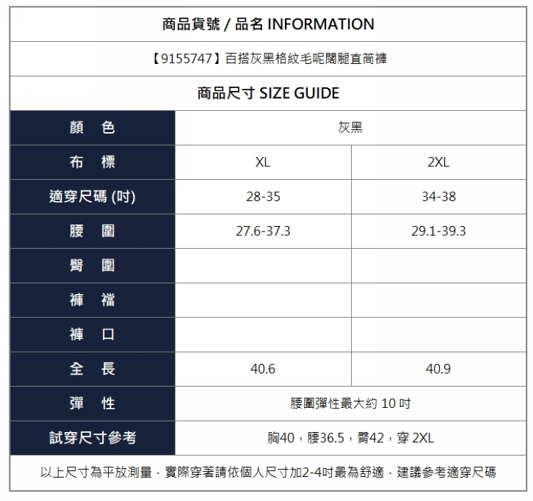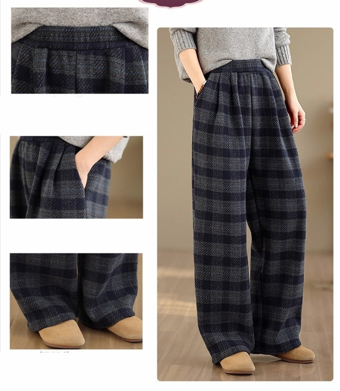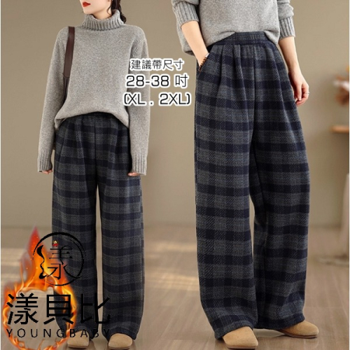漾貝比【9155747】中大尺碼女裝 百搭灰黑格紋毛呢闊腿直筒褲 (28-38)