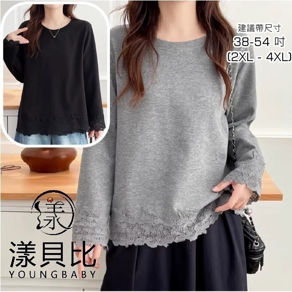漾貝比【9155785】中大尺碼女裝 圓領下襬袖口拼接花邊蕾絲棉上衣.共2色(38-54)