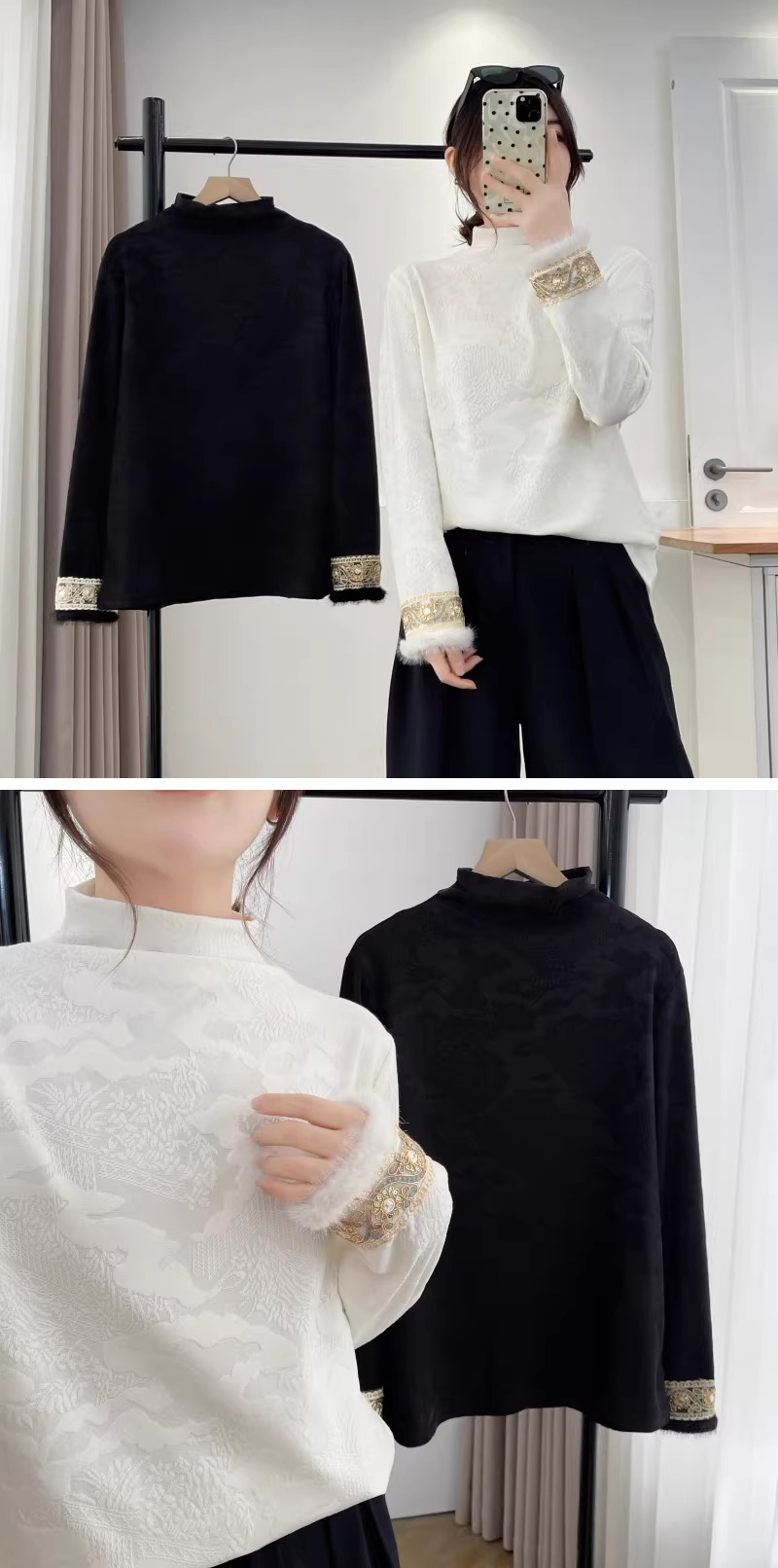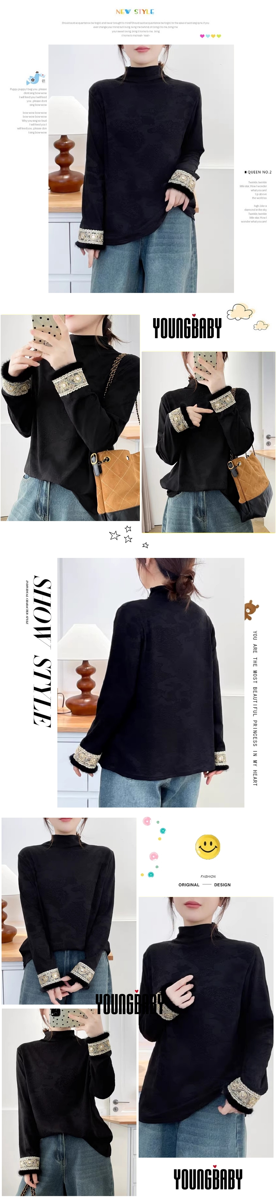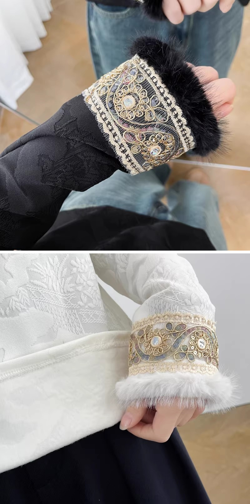 漾貝比【9155786】中大尺碼女裝 袖口繡金邊花蕾絲緹花加絨上衣.共2色(36-52)