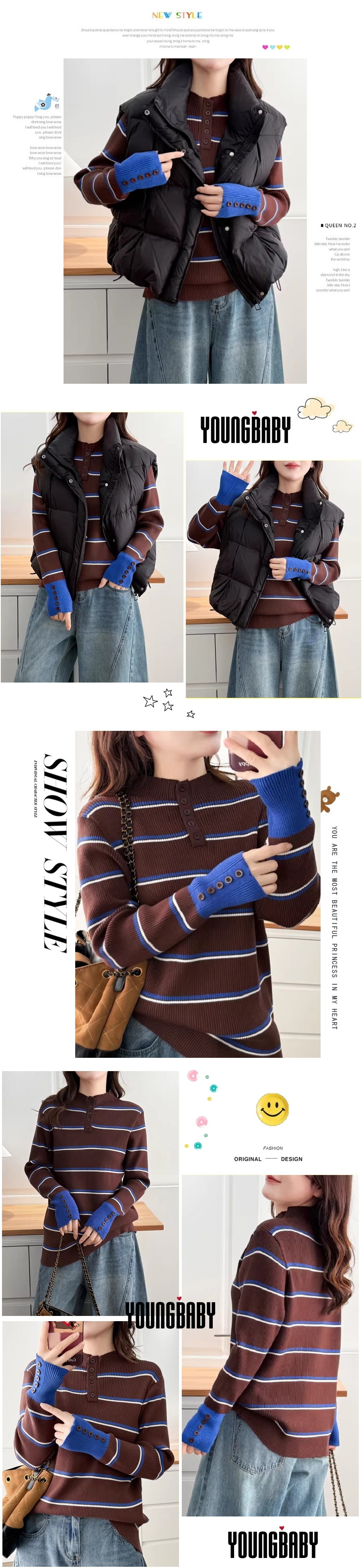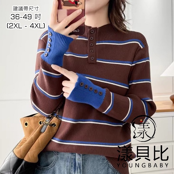 漾貝比【9155787】中大尺碼女裝 半高領鈕扣撞色條紋針織毛衣(36-49)