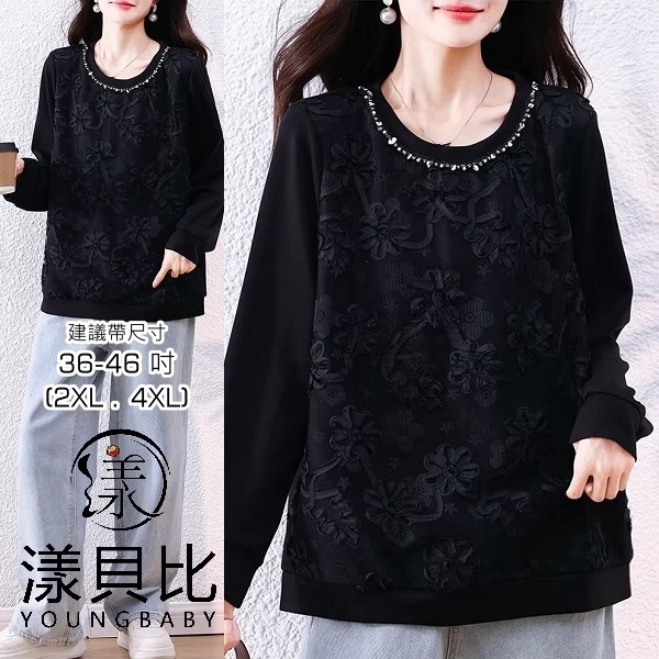 漾貝比【9155794】中大尺碼女裝 圓領釘珠時尚拼接花蕾絲織衣上衣(36-46)