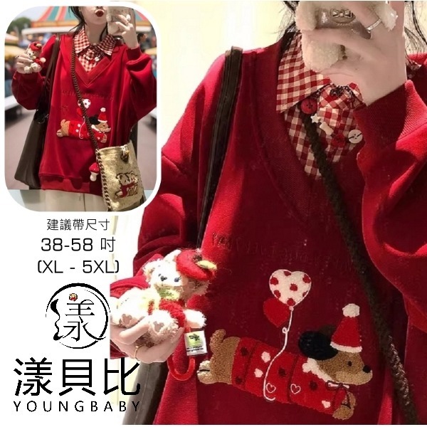 漾貝比【9155800】中大尺碼女裝 美式復古刺繡臘腸狗拼接格紋假兩件式上衣(38-58)