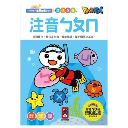 大醬童書專賣店 賣場商品依訂單開立統一發票, 隨貨寄出。 如需開立統一編號, 下單時請在訂單處加註清楚。 超商取貨有體積及重量的限制請留意: 物品大小長+寬+高總和≦105公分, 且最長邊需≦45公分, 其他兩邊需≦30公分, 重量需≦5公斤! 一般讀本和繪本大約**8本**左右 若單筆超過體積及重量的限制, 請拆開為適當的訂單數量。 內容簡介 看圖學注音,跟著FOOD超人練習寫ㄅㄆㄇ!      依照筆畫順序練習寫ㄅㄆㄇ,藉由圖像認識拼音,進而嘗試練習發音、學習國字,提升閱讀能力。書中附贈FOOD超人獎勵貼紙,讓孩子增加書寫的樂趣。   把握學習黃金期,在學前打好基礎,可減輕孩子未來入學的壓力,並能獲得自信與成就感!   商品功能:   ★練習ㄅㄆㄇ的筆順寫法。   ★提升識字、認知及語言能力。   ★綜合ㄅㄆㄇ練習驗收學習成效。   ★內附彩色貼紙,增加學習興趣。   ★反覆練寫,建立紮實的基礎。   附贈:70枚獎勵貼紙 商品特色   1. ㄅㄆㄇ筆順練習   ㄅㄆㄇ是孩子學習語文的基礎,可愛的圖片加上正確筆順,讓孩子在練習寫注音的同時,增進運筆能力。   2. 提升語文能力   學習聲符、韻符、結合韻符及58個生活語詞,練習拼音,輔助孩子閱讀,奠定國語文基礎。   3. 附贈獎勵貼紙   隨書附上FOOD超人可愛獎勵貼紙,給孩子愛的鼓勵,提升成就感與學習樂趣,讓孩子快樂學語文。